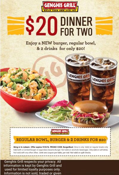Copy this coupon code and save big when you purchase at Genghis Grill. Genghis Grill Coupons Discounts Codes Deals. Thank you for the feedbackYour feedback is being reviewed.